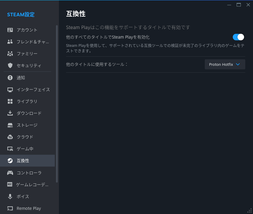 有効化は簡単で、設定>互換性より「他のすべてのタイトルでSteam Playを有効化」をオンにすれば解決します。
